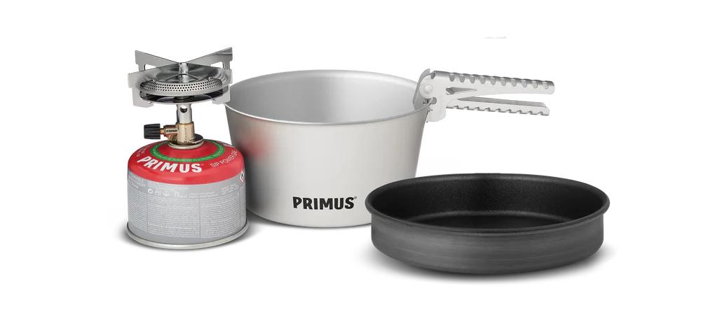 Mimer Backpacking Stove Kit включва горен газов котлон със здрава конструкция и четириточкова опора за защита от вятър и допълнителна стабилност. Двете тенджери от твърдо анодиран алуминий са с вместимост 1.3 л и 2.3 л, а керамичният незалепващ капак служи и като тиган. Комплектът включва и щипка за тенджери за лесно и безопасно боравене с горещи съдове. Всички елементи се прибират един в друг и се съхраняват в здрав найлонов калъф. Газът не е включен – закупува се отделно Primus Power Gas, Summer Gas или Winter Gas.