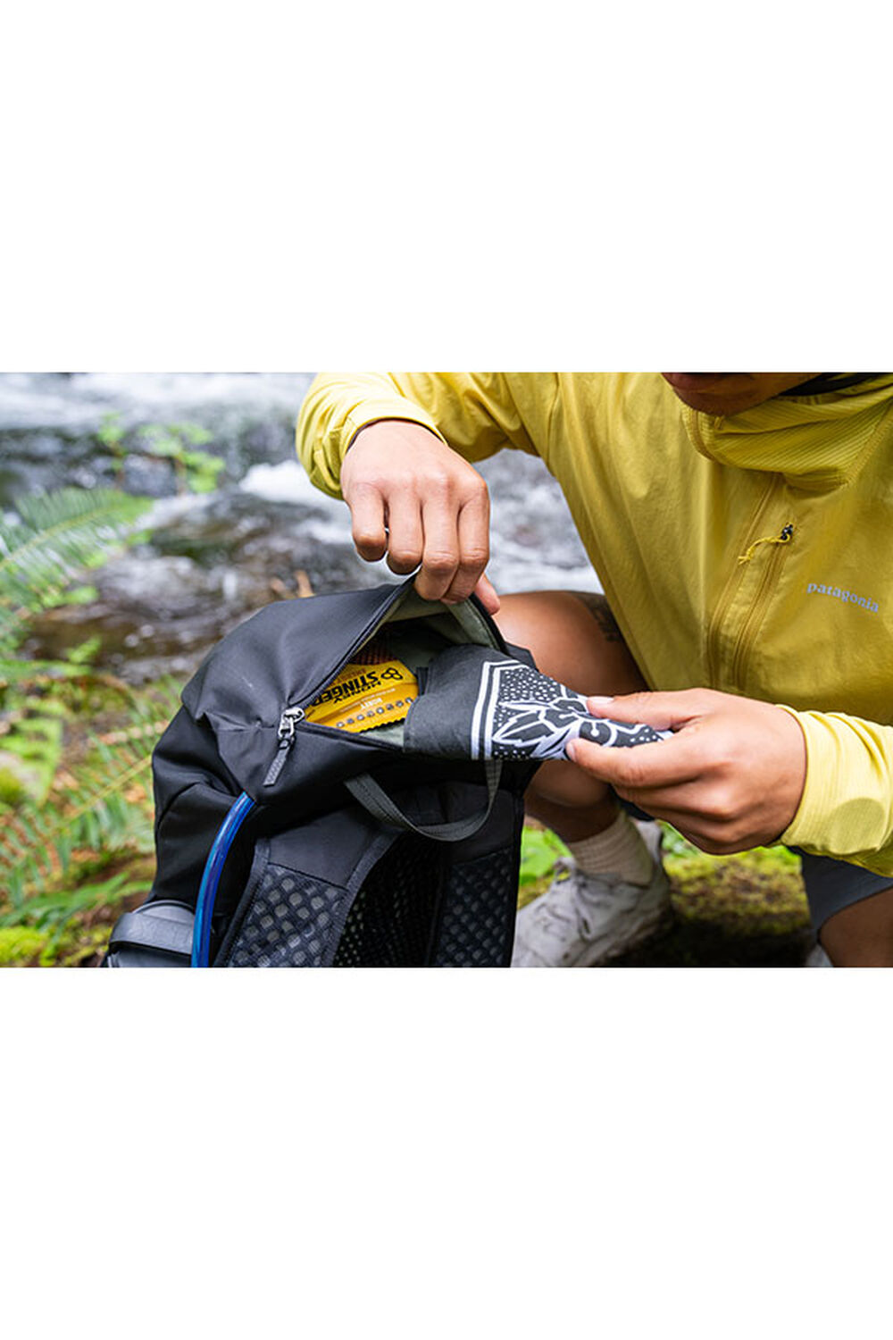 Гръдна стабилизираща лента: включва вградена предпазна свирка и щипка за фиксиране на хидратиращ маркуч.